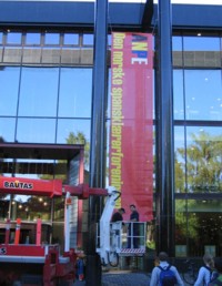 Ayer a las ocho de la mañana Carlos, el ecuatoriano del "Teknisk avd." de la Biblioteca, colgó la pancarta.